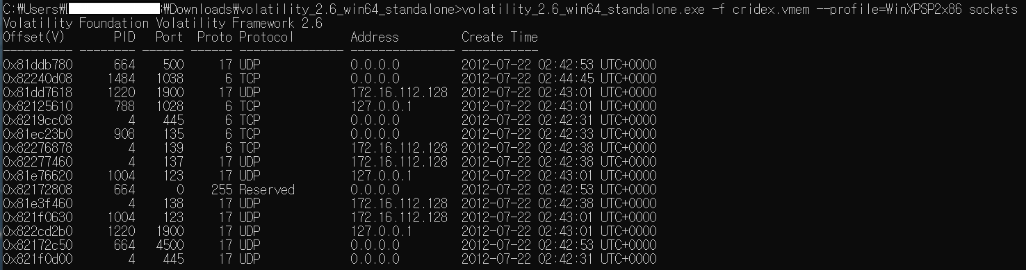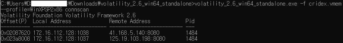 따라서 cridex.vmem 파일 분석 결과 악성코드에 감염되었음을 확인 할 수 있다.