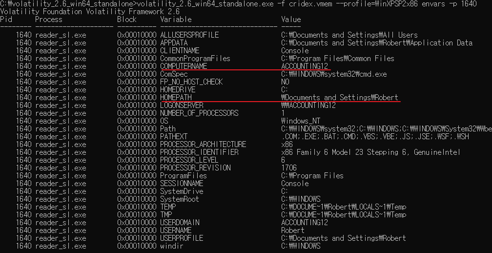 [envars] 명령어를 통해 Pid 1640의 환경 변수 정보를 확인한 결과, 컴퓨터 hostname은 'ACCOUNTING12', 폴더내 경로에서 사용자 이름은 'Robert'를 확인하였다.