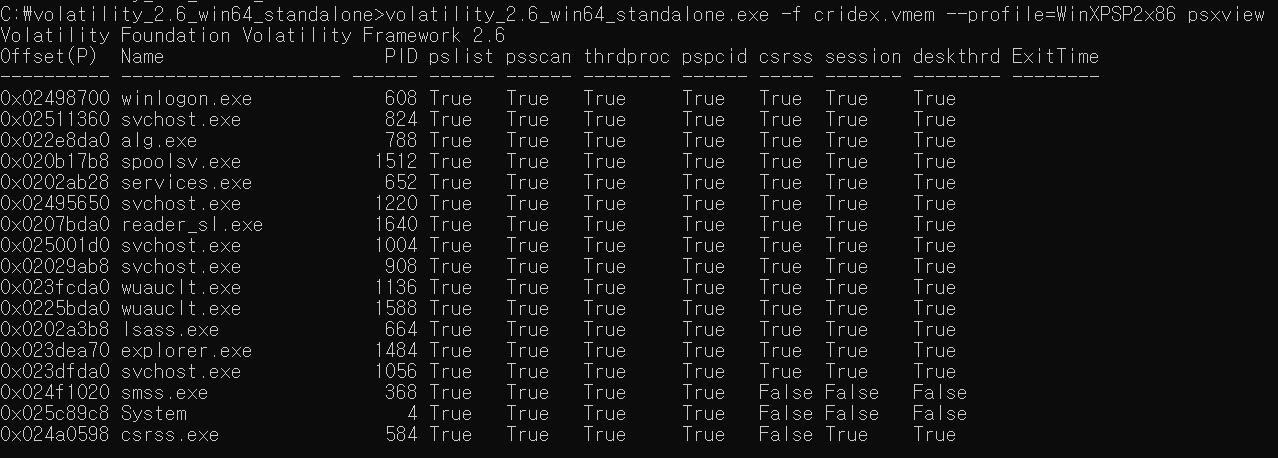 [psxview] 명령어를 통해 숨겨진 프로세스 확인시 특이사항을 발하지 못함