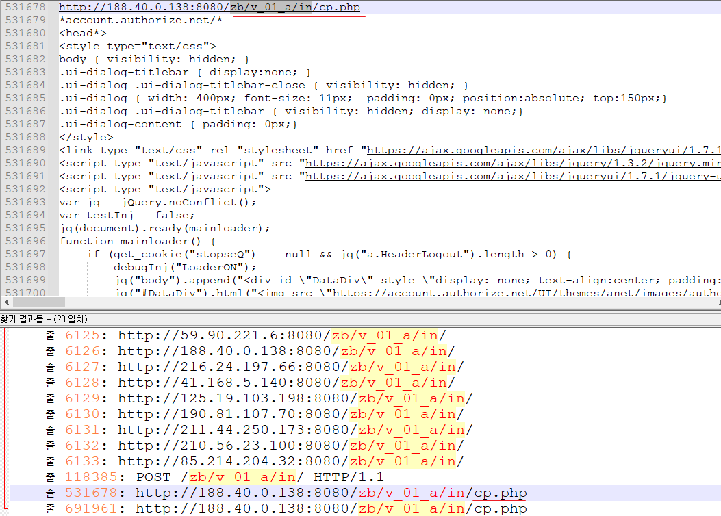 추출한 파일에서 아까 의심했던 IP주소 : 41.168.5.140, 125.19.103.198로 문자열 검색을 해보았다. /zb/v_01_a/in/ URI를 발견하였고, cp.php 파일을 발견하였다.