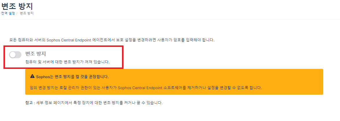 소포스 센트럴 대시보드에서 "변조 방지"를 진입해줍니다.